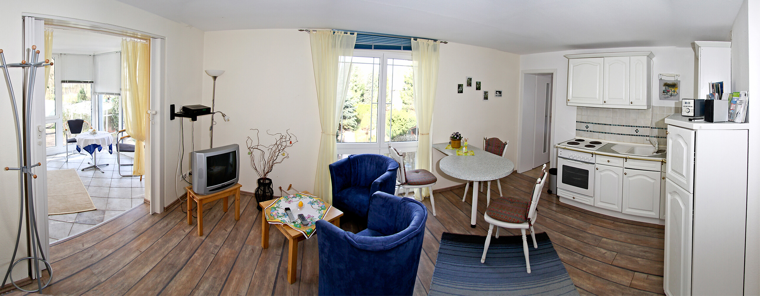 Die Wohnung im ersten Stockwerk verfügt über zwei Schlafräume mit je zwei Zimmern, einen Wohnraum mit amerikanischer offener Küche, einen Wintergarten sowie ein Bad mit Wanne und Dusche.